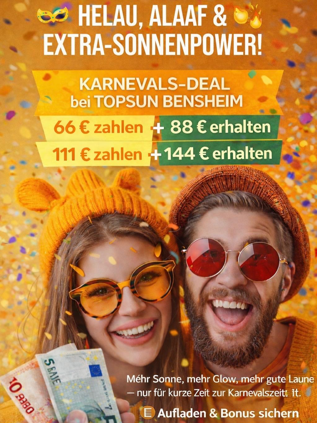 Nur für kurze Zeit. 💛 Top Sun Bensheim – deine Portion Sonne das ganze Jahr! Helau & Alaaf! ☀️🎉